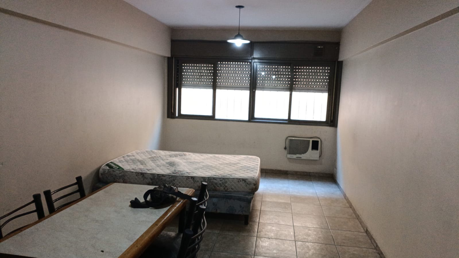 Cama dos plazas con colchón, mesa con cuatro sillas, heladera chica y placard chico. AIRE ACONDICIONADO.